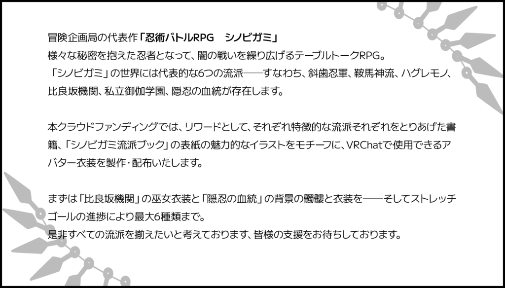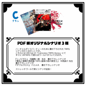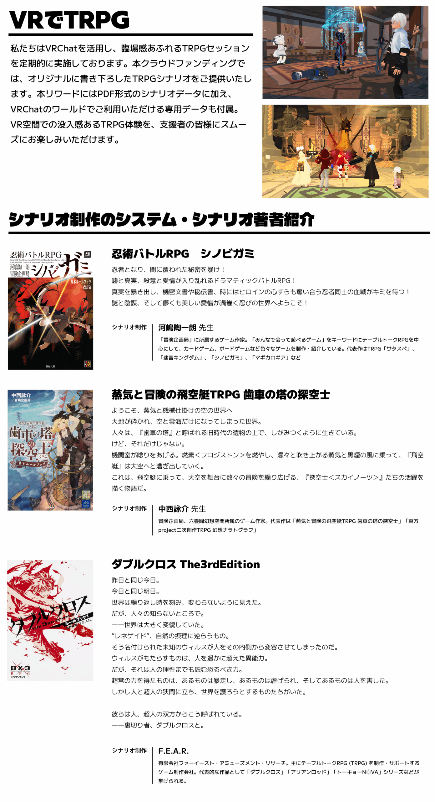 - VRTRPG製作費用(シナリオ作成やワールド、システムの開発に使用されます)