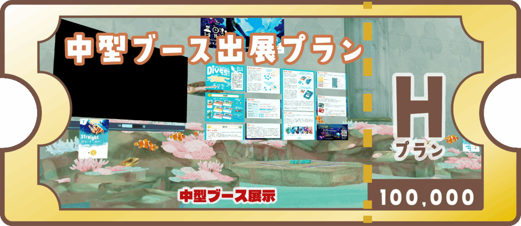 中型ブース出展プランは、10m x 10mのスペースに自由に制作された3Dブースを配置できる豪華ブースプランです。
